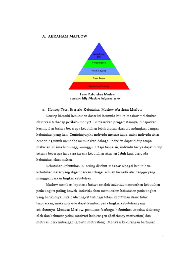 Dengan demikian minimal akan dipenuhi kebutuhan dasar manusia yang meliputi sandang, pangan, papan dan kesejahteraan sosial dengan sumber pendapatan yang cukup. Abraham maslow dikenal sebagai pelopor aliran psikologi humanistik. Butuh individu kebutuhan kebutuhan dasar manusia manusia sosial. Kebutuhan dasar manusia 1 2 mahasiswa sekalian dalam bab ini dibahas tentang konsep kebutuhan dasar manusia, model kebutuhan manusia menurut beberapa ahli, konsep kebutuhan psikososial, spiritual dan seksual. Kebutuhan dasar manusia menurut abraham maslow abraham maslow dilahirkan di brooklyn, new york, pada tahun 1908 dan wafat pada tahun 1970 dalam usia 62 tahun.
